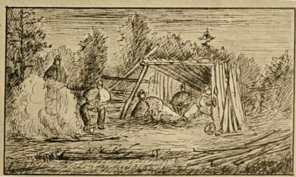 As the whole afternoon was before us, we at once set to work to make our bivouac more than ordinarily comfortable. Rails being the first requisite, we collected quite a pile, and then commenced on our shanty. Planting two rails firmly in the ground, inclined towards each other and crossing a little at the top in this manner X, we secured them in this position with blanket straps, and the length of a rail distant, planted two more in like manner. A rail laid in the notches formed the ridge-pole of our house, and rails slanted from this pole to the ground completed the frame-work. The covering for the roof consisted of our rubber blankets, making a waterproof hut, of which we were very thankful before our stay in that spot was over.