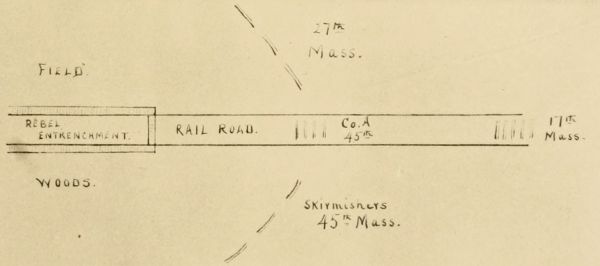 Unable to ascertain the strength of the enemy, except that there was a "right smart heap," and uncertain whether they had artillery or not, the colonel decided, nevertheless, to advance without awaiting the arrival of the other column. Accordingly, five companies of the 45th filed off to the left, and deploying as skirmishers, advanced through the field back of the house, leaving the sixth company, Co. A, to guard the colors, the 17th Mass. acting as reserve. The firing soon became very brisk along the line of the works, and the enemy's force was estimated at from three to five hundred.