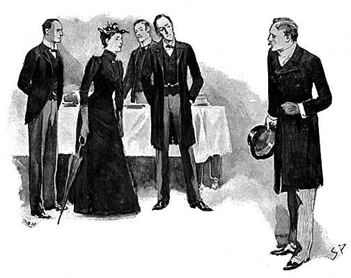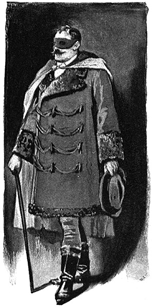 A man entered who could hardly have been less than six feet six inches in height, with the chest and limbs of a Hercules. His dress was rich with a richness which would, in England, be looked upon as akin to bad taste. Heavy bands of Astrakhan were slashed across the sleeves and fronts of his double-breasted coat, while the deep blue cloak which was thrown over his shoulders was lined with flame-colored silk, and secured at the neck with a brooch which consisted of a single flaming beryl. Boots which extended half-way up his calves, and which were trimmed at the tops with rich brown fur, completed the impression of barbaric opulence which was suggested by his whole appearance. He carried a broad-brimmed hat in his hand, while he wore across the upper part of his face, extending down past the cheekbones, a black vizard mask, which he had apparently adjusted that very moment, for his hand was still raised to it as he entered. From the lower part of the face he appeared to be a man of strong character, with a thick, hanging lip, and a long, straight chin, suggestive of resolution pushed to the length of obstinacy.