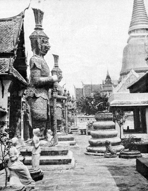 Durch mein mehr als energisches Auftreten hat Phya Smud den Ausflug nach Ayuthia, der früheren Hauptstadt des Reiches, nach vielem Zögern arrangirt; früh 6 Uhr wurden wir flott – ein sogenanntes »Houseboat« enthält alles Gepäck, die Vorräthe (für eine Woche genügend), den Weinkeller, Eis, dazu den chinesischen Koch und drei andere Celestials, sowie acht Matrosen, – die Barkasse führt uns vier, Phya Smud, den Heizer und Steuermann, – die kleinen Siamesen sehen in ihren weissen Uniformen recht possirlich aus. – Langsam dampfen wir stromauf, nach etwa einer Stunde verschwinden die letzten Häuser, darunter das grosse französische Missionsgebäude. – Niedriger Wald, hauptsächlich Jungle, vereinzelt eine Hütte, hie und da ein Rasthaus (Sala), ein offenes, auf vier Holzpfeilern ruhendes Häuschen mit Matten, die als Schlafstellen für Reisende dienen. Ein junges Krokodil taucht dicht neben uns auf, begleitet uns ein Stück, zieht sich aber bei dem beginnenden Schnellfeuer rasch zurück. Mehrere grosse mit Reis beladene Boote kommen entgegen; sie führen die Ernte aus Laos in die Bangkoker Schälfabriken. – Zahlreiche Adler umkreisen uns, am Ufer hocken schöne weisse Edelreiher, prächtige blaue Eisvögel, Strandläufer, zahlreiche Pfaue, merkwürdige Goldfasane in allen Farben des Regenbogens. Der Chef und ich schiessen von allen mehrere Exemplare, besonders pfeffern wir in einen ganzen Schwarm Wildenten (Teals), von denen 13 fallen, auf meinen ersten Schuss allein vier Stück. Gegen Mittag gerathen wir auf eine Sandbank und kommen nur nach angestrengter Arbeit wieder los. Dabei ist die Hitze hier unter dem einfachen Leinenzelte der Mouche, im vollen Sonnenbrande und in unmittelbarer Nähe der kleinen Dampfmaschine, ganz unerträglich. Sogar Neptun ist schlapp geworden und weigert sich ans Ufer zu gehen, um das geschossene Wild zu holen (seine Begleiterin, die gute Hündin Bompa, ist seit Singapore krank und hat ganz aufgehört zu fressen – sie ist unter Harrisons Pflege im Hôtel zurückgeblieben). – Nach neunstündiger Fahrt biegen wir rechts in einen schmalen Canal ein und halten in Bang-Pa-In, dem Sommerpalais des Königs. – Ein grosser Park mit zahlreichen ganz europäischen Baulichkeiten, sowie ein reizender hölzerner Pavillon im reinsten siamesischen Stile. – Zwei australische Strausse (Casuare) wandern im Garten umher. Ein Renaissancetempel mit dorischen Säulen wird für uns in Ordnung gebracht, in einem geräumigen Saale stehen vier Betten mit Netzen, in einem zweiten servirt der chinesische Koch ein exquisites Mahl, darunter die Wildenten! Wir sind mit dem Kaffee und Crême de Cacao beschäftigt, da tönt eine Glocke aus nächster Nähe – der »Angelus« im Innern Siams! Wir laufen hinaus und entdecken auf einer benachbarten Insel eine perfecte gothische Kirche, d. h. ein Wat im gothischen Stile. – Thurm, drei Schiffe, Kreuzfenster mit dem eingebrannten Bilde des Königs und der lateinischen Inschrift »Chulalonkorn, Rex Siamensis«, Hochaltar, auf dem ein goldener Buddha sitzt, – Seitenaltäre mit kleineren Buddhas, – Sacristei – und im Thurme die schöne Glocke, die, nach Sonnenuntergang geläutet, uns im Geiste nach Europa versetzt hatte.