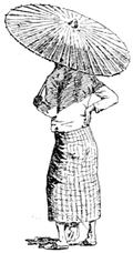 Auf dem Vorderdeck lagert eine Schar siamesischer Bonzen, hagere, knochige Kerle, das Kopfhaar vollständig rasirt, in safrangelben Mänteln drapirt, ganz togaartig, – sie kommen auch aus Mandalay, wo ihnen das Reisegeld ausgegangen war, und wo ihnen Prinz Naris unter die Arme greifen musste. – Mit letzterem und seiner Suite suche ich nähere Bekanntschaft anzuknüpfen; leider happert es sehr mit der Sprache, da ihr Englisch recht mangelhaft ausfällt. Doch lerne ich, dass der König alle Winter eine grössere Reise macht, immer mit kolossalem Gefolge, dass er dadurch sein ganzes Reich nach und nach genau kennen lernt, mit den Provinzialbehörden in Fühlung kommt, überall Fahrstrassen baut etc. – Diesmal geht seine Tour nach Chayok, einem District im Nordwesten Siams, an der burmanischen Grenze, und dürfte er nicht vor 6-7 Wochen in seiner Hauptstadt wieder eintreffen. – Prinz Naris scheint Höllenangst vor seinem erlauchten Bruder zu haben, schmiert fort an seinem Berichte und ist in grosser Aufregung, noch rechtzeitig anzukommen. Er und seine Leute sind klein, gut genährt, von hellgelber Hautfarbe, geschlitzten Augen, entschieden mongolischem Typus; sie tragen die neue Hoftracht: weisser leinener Waffenrock mit goldenen Knöpfen und ebensolchen Achselschnüren; anstatt der Hosen ein weites buntes Tuch (Sarong), welches um und zwischen die Beine geschlungen bis zu den Knien reicht und an der Seite eingeschlagen wird; dazu weisse Strümpfe und schwarze Schnallenschuhe und ein weisser, mit Goldspitze verzierter indischer Sonnenhelm. – Bei Tisch servire ich californische Pfirsiche, die in Singapore von mir eingekauft sind, und lache über ihre erstaunten Gesichter; so was haben sie nie gegessen!