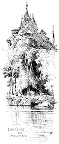 Mit der »Ramapura«, einem schönen Schaufeldampfer, der 15 Knoten macht, und dessen deutscher Commandant Cruzer famose Getränke braut, um 7 Uhr früh nach Maulmain, der schönsten Stadt Burmahs, am Salween reizend gelegen. – Holzsägen, wo abgerichtete Elefanten riesige Baumstämme aus dem Flusse holen, in die Maschinen legen und die gesägten Hölzer in den Höfen regelmässig aufschichten – ein kleiner Elefant hat's auf mich abgesehen und kann ich mich nur durch die schmählichste Flucht retten, zum Jubel der Schiffsgenossen. – In der Mitte der Stadt auf hohem Hügel die Hauptpagode mit unvergleichlicher Aussicht auf den Salween und die nahen Berge. – Abends wandeln wir alle zum geräumigen Club, Gymkhana; da Cruzer uns einzuschreiben vergessen hat, werden wir aber, zu unserer grossen Heiterkeit, von den eurasischen Bediensteten feierlich hinausgeworfen. – Uebernachten auf der »Ramapura«, denn bis zu einem Hôtel hat es Maulmain noch nicht gebracht.