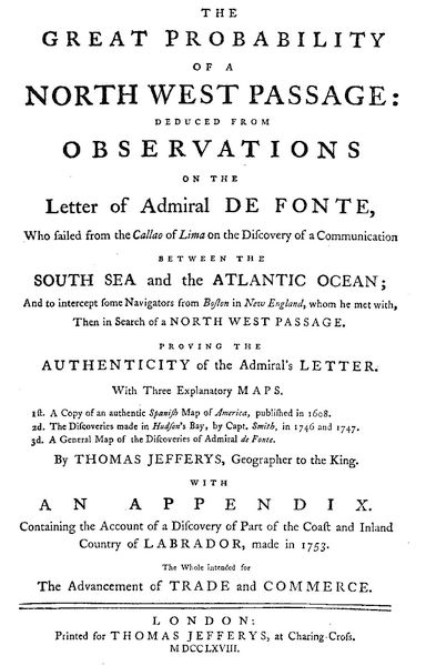 There was a Generosity with respect to the Discovery of a North-west Passage, or a Respect to the great Abilities of those who promoted the various Undertakings for making such Discovery, to the Crown which patronized them, and the Estates of the Kingdom who promised a most munificent Reward to such who should compleat such Discovery, that those who were of a contrary Opinion treated the Subject with a becoming Decency. But the Censures that have been of late made by our Countrymen, and more particularly by Foreigners, our Ancestors have been treated as so many Fools, or infatuated Persons, busied to compleat an impracticable and a merely chimerical Project, and are accused by a foreign Geographer to have proceeded so far as to forge a fictitious Account under the Title of a Letter of Admiral de Fonte. That the Iniquity of the English Writers is not such (neither was ever known to be such) nor, was it in their Inclination, could they so easily deceive the World; and theviii Falshood of this Assertion could be no otherway made apparent than by considering such Letter with a just Criticism, and examining the Circumstances relating thereto. Though the present Age may not pay much Regard to these Censures, yet if they are passed unnoticed, might hereafter be considered as Truths unanswerable at the Time those Censures were made. Therefore to do Justice to the Character of our Ancestors, to the present Age in which such great Encouragement hath been given to these Undertakings, and that Posterity might not be deceived, were Motives (had they been duly considered without a Regard to the Importance of the Subject) which might incite an abler Pen to have undertaken to vindicate the Authenticity of de Fonte's Letter. As for a long Time nothing of this Kind appeared, nor could I hear that any Thing was undertaken of this Sort, by any Person to whom I could freely communicate my Sentiments, and the Informations which I had collected on this Subject, as the Discovery of a North-west Passage hath been the Object of my Attention for some Years, considered myself under the disagreeable Necessity of becoming an Author in an Age of such refined Sentiments, expressed in the greatest Purity of Language: But if I have succeeded in the greater Matters, I hope to be excused in the lesser.