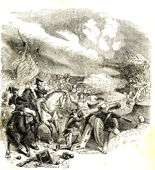 Here is a picture of that sad scene. The cannonading is still going on, while they are carrying away from the ramparts two wounded men. You see in the picture, they are feeling the heart of one of them, hoping that it still beats. Do you see the brave fellow who is planting the flag? I must tell you about him. He is a Mr. Hart. When Mrs. Anderson wanted to go on to Charleston to see her husband, whose health was very delicate, Mr. Hart escorted her. He stayed in the fort, and was there during the fight. When our glorious flag was shot down, Mr. Hart seized it, nailed it to a pole, bounded up on the ramparts, and planted it again, amidst the cheers of the men. I think it was a splendid thing to have[34] done! General Anderson has that stained, torn, but priceless flag now; and he says he is only waiting to plant it once more with his own hands over Fort Sumter. He has one dear little boy, who is named Robert after him. I think Robbie, as they call him, ought to be a proud boy; for his father will leave him what is far above untold gold—a spotless and honorable name.