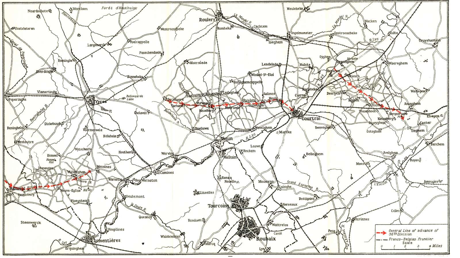 | Attack of September 28th—Advance of September 29th—Menin-Roulers Road reached—Review of Situation—Death of Captain Bruce—Attack of October 14th—A Great Day—Courtrai entered—Difficulties of Supply. | ||