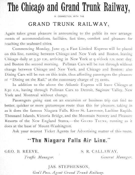 The Smoking Car, Day Coach and one Sleeping Car run through to Buffalo via M. C.; one Sleeping Car runs through to Toronto via M. C. and Credit Valley Railways; one Sleeping Car runs through to New York via M. C. and N. Y. C. The Dining Car serves dinner out of Chicago at 5 o'clock; train arrives in Buffalo in good season for breakfast.
