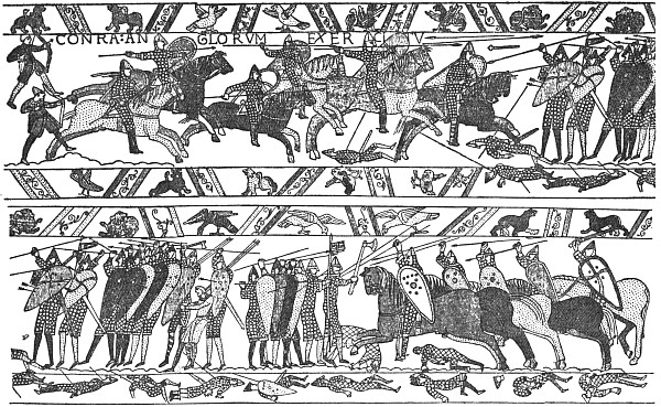 The field of Senlac has been examined by the authors in the company of Sir Augustus Webster, Bart., the present owner of Battle Abbey, himself a practical soldier. The result of their investigations has been to convince them that the line of the Norman advance lay considerably to the east of where it is generally placed, and that the great bulk of Harold’s army was massed about the site of the abbey itself. His right wing, being almost unassailable owing to the protection given to it by the marshy ground in its front, was probably very weakly held. Relying on the contemporary evidence of the Bayeux tapestry, and considering the circumstances of Harold’s march, the authors are inclined to discount any effective entrenchments or palisading.