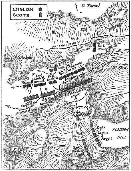 In regard to the strategy and tactics of Flodden, a close study of contemporary documents andix authorities tends to emphasize certain features which are often overlooked or ignored. First, the Scottish army evidently changed its position twice to counteract Surrey’s puzzling flanking movement. Second, it can have had no proper service of scouts, and was too cumbrous to manœuvre readily, circumstances which left it at the mercy of its numerically inferior antagonist. Third, it was never able to form a complete line of battle owing to the slowness of the right wing in coming into action. Fourth, so far as appears from the letters of the English leaders, there was no slackness on the part of the Scottish Lord Chamberlain who commanded the left wing.