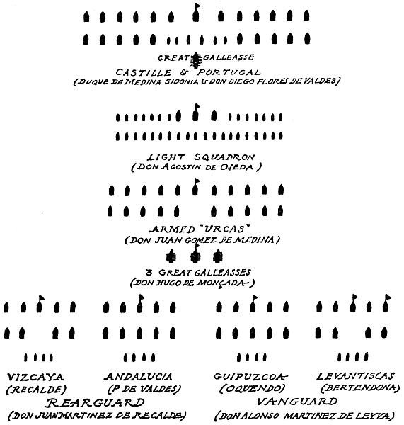 Much has been written on the relative strengths of the English and Spanish fleets in 1588. The authors’ opinions may be summarized as follows: (1) The Spaniards had an undoubted superiority in tonnage, but in strength of ships actually built for war the English had the advantage. (2) The English ships, being manned by a majority of sailors, were infinitely better handled; and the galleons of the Royal Navy were faster sailers than those of the Spanish. (3) There is no real reason to think that the Spaniards were outmatched in number and power of guns, but the English gunnery, though bad, was better and more rapid than that of their antagonists. (4) The Spanish tactics, as compared with that of the English, was antiquated, being based on the formation of line abreast and a close order, which hampered the manœuvring of individual ships and impeded the use of broadsides.