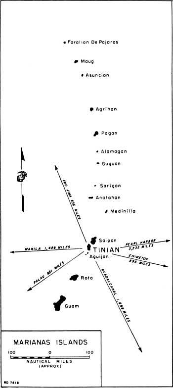 The 4th Division had had a busy, if slightly less demanding, year as well. It went directly into combat after its formation at Camp Pendleton, California, landing on 31 January 1944 in the Marshall Islands where it suffered moderate casualties—fewer than 800 men—in the capture of Roi-Namur. At Saipan its losses reached 6,000, including about 1,000 dead. The Tinian landing would be its third in a little over six months and would be the first under a new divisional commander—Major General Clifton B. Cates, a well-decorated3 World War I veteran, who would become the 19th Commandant of the Marine Corps in 1948.