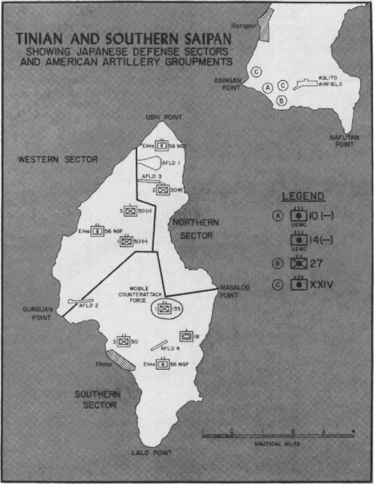 To give the 4th more punch immediately after landing, the 2d was stripped of some of its firepower, such as tank and artillery units. It would, accordingly, be at the lowest strength at Tinian of any Marine division involved in an amphibious operation in World War II.