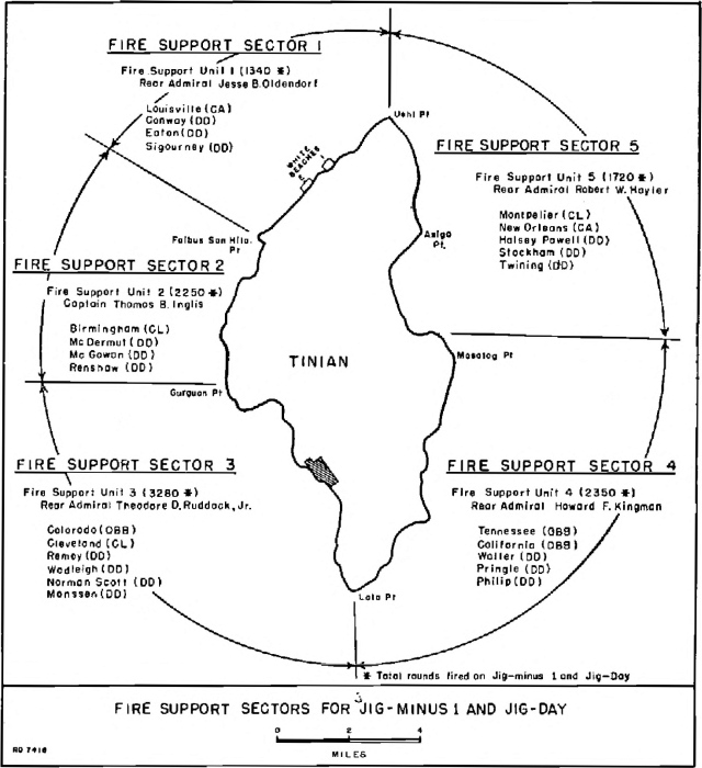 The morale of the troops was sustained by the preinvasion fires directed at Tinian. For Jig minus 1 and Jig Day (Jig being the name given to D Day at Tinian), Rear Admiral Harry W. Hill, commander of the Northern Landing Force, had divided the island into five fire support sectors, assigning specific ships to each. His purpose was two-fold: destruction and deception to confuse and deceive the Japanese as to the landing intentions of the Marines.