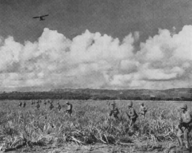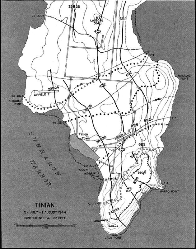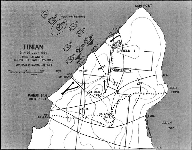 Within an hour, the entire 1st and 2d Battalions of the 24th were ashore on White 1, preparing to move inland. The 2d Battalion encountered sporadic artillery, mortar, and small arms fire during the first 200 yards of its advance. After that, Garretson later said, the battalion had a “cake walk” for the rest of the day gaining 1,400 yards and reaching its O-1 line objective by 1600. He occupied the western edge of Airfield No. 3 and cut the main road linking Airfield No. 1 with the east coast and southern Tinian. Only occasional small arms fire was encountered before the battalion dug in for the night.