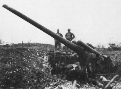 Even enemy weapons, such as this Japanese 120mm type 10 naval dual-purpose gun located not-too-far inland from the invasion beaches, was put out of action, but not before it, and two 6-inch guns, hit the battleship Colorado (BB 45) and destroyer Norman Scott (DD 690) causing casualties before being destroyed.