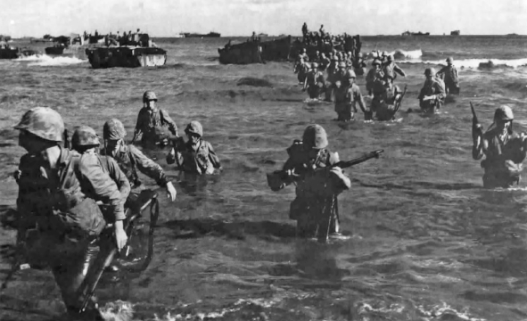 While some Marines were deposited “feet dry” beyond the shoreline of the beaches, others had to land “feet wet” wading ashore in the shallows from the amtracs which brought them in from the attack transports seen in the background.