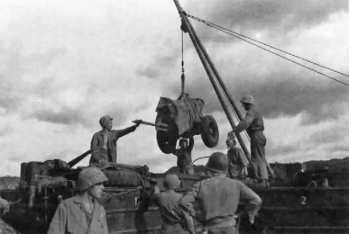 For Tinian, as in the Marshall Islands and the Saipan and Guam operations, DUKWs (amphibian trucks) were loaded with artillery pieces and ammunition at the mount out area. At the objective beaches, they were driven ashore right to the designated gun emplacements enabling the gun crews to get their weapons laid in and firing quickly. Here, an A-frame unloads a 75mm pack howitzer from an Army DUKW.