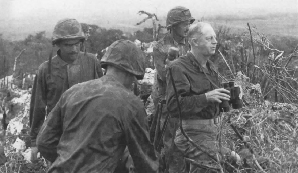 Watson had earned a reputation at Saipan as a hard-charging leader. When the division stalled fighting its way up Mount Topatchau, he was unimpressed. The historian Ronald Spector wrote, in the midst of that effort, “he was heard shouting over a field telephone, ‘There’s not a goddamn thing up on that hill but some Japs with machine guns and mortars. Now get the hell up there and get them!’” His assistant division commander was Brigadier General Merritt A. “Red Mike” Edson, who was awarded a Medal of Honor for his heroism on Guadalcanal.