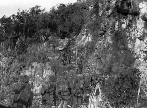 At White 1, members of a small Japanese beach detachment, holed up in caves and crevices, resisted the landing with intense small arms fire. But they were silenced quickly by Company E gunners.