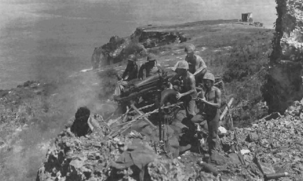 Behind the beach, troops from Ogata’s 50th Regiment put up a vigorous defense with mortars, anti-tank and anti-boat guns, and other automatic weapons emplaced in pillboxes, caves, fortified ravines, and field entrenchments. Two 47mm guns in particular kept the Marines back on their heels. They finally bypassed these troublesome positions. Later waves took them out, leaving 50 dead Japanese in the gunpits.