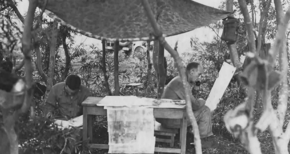 “While most of these Japanese crept along just forward of the lines,” Carl Hoffman wrote, “... a two-man reconnaissance detail climbed up on a battered building forward of the 24th Marines and audaciously (or stupidly) commenced jotting notes about, or drawing sketches of, the front lines. This impudent gesture was rewarded with a thundering concentration of U.S. artillery fire.”