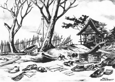 Almost simultaneously, the 25th ran into problems. The beach and surrounding area had been methodically seeded with mines which neither UDT teams nor offshore gunners had been able to destroy. It took six hours to clear them out and in the process three LVTs and a jeep were blown up. The beach defenses also included a sprinkling of booby traps which had to be dealt with—watches and cases of beer, for example, all wired to explode in the hands of careless souvenir hunters.