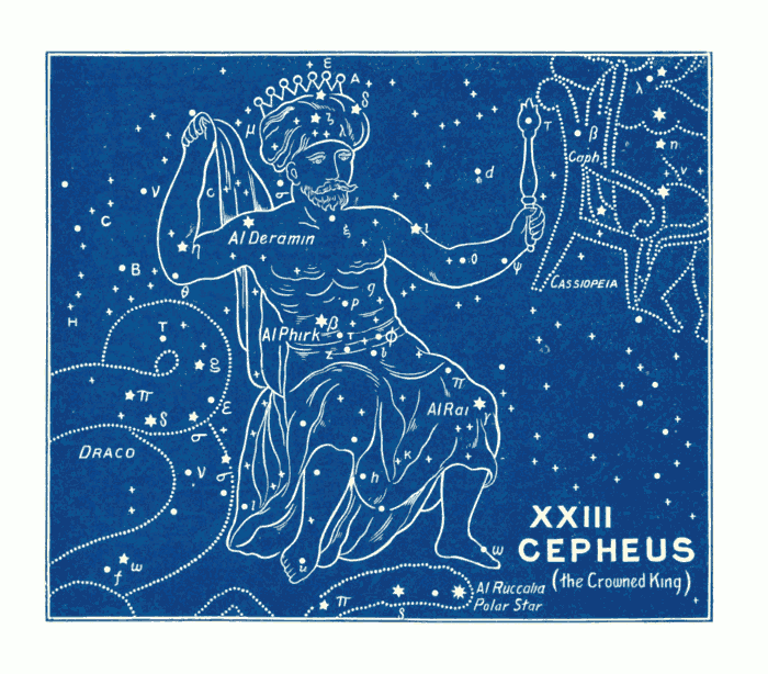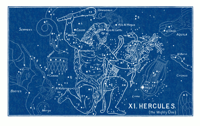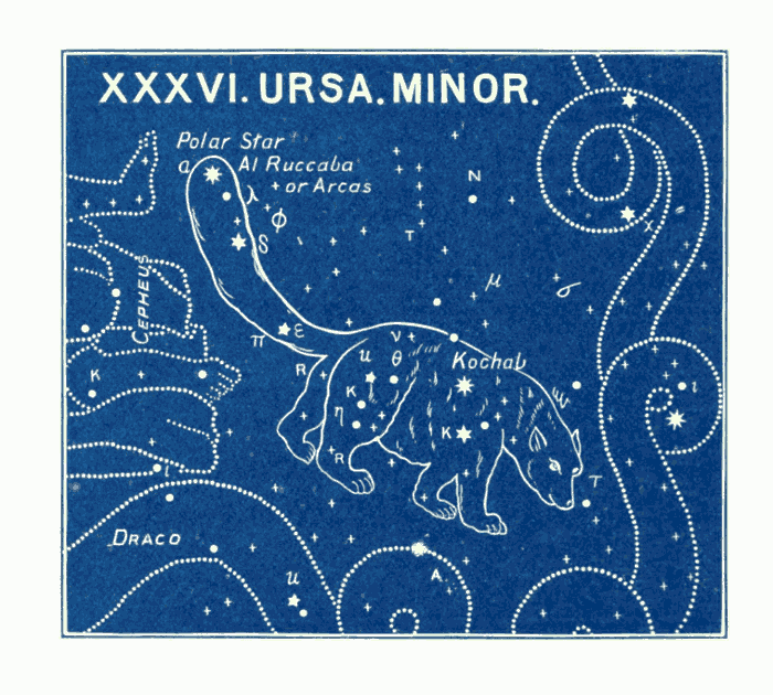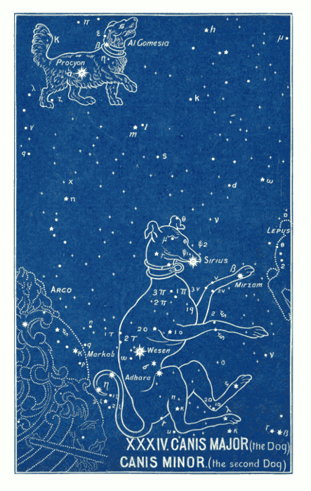 The constellation of the Canes Venatici (the Greyhounds), i.e., the two dogs (Asterion and Chara), which Boötes holds by a leash, is quite a modern invention, being added by Hevelius (1611-1687). The bright star of the 3rd magnitude in the neck of Chara, was named “Cor Caroli” (the heart of Charles) by Sir Charles Scarborough, physician to Charles II., in honour of Charles I., in 1649. This is a good example of the almost infinite distance between the ancient and modern names. The former are full of mysterious significance and grandeur, while the latter are puerile in the extreme, almost approaching to the comic! e.g., the Air Pump, the Painter's Easel, the Telescope, the Triangle, the Fly, the Microscope, the Indian, the Fox and Goose, the Balloon, the Toucan (or American Goose), the Compasses, Charles's Oak, the Cat, the Clock, the Unicorn, &c. The vast difference can be at once seen between those designed by the ancients and those added by astronomers in more recent times.