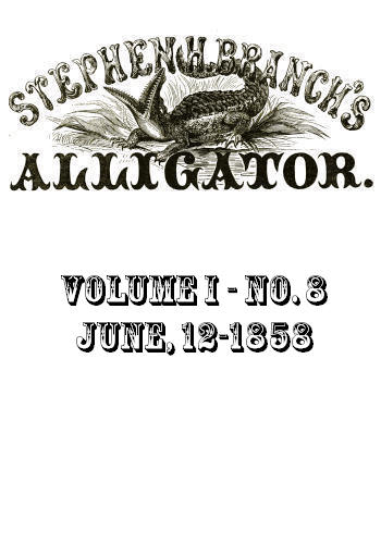 Dear Sir,—As a reader of your rapacious Alligator, and a warm sympathiser with you throughout your misfortunes, I think I am entitled to make a suggestion, which I believe to be for your own good. I want to praise the manner in which you have conducted your Journal thus far, and it is because I do not, wish to see it unworthy of consideration that I have taken the liberty to write to you—a perfect stranger, as far as personal acquaintance goes. Your sanguinary and characteristic[8] fearless attacks on the magnates of Tammany and the City Hall have won you great favor among the honest and peaceful citizens of New York, as well as elsewhere, but I am of opinion that an attack on the city press would only be productive of serious mischief to yourself. In your latest number, you mention the apparent slight of the Alligator by Bennett, Greeley, and Raymond, and avow your intention to “let up” on them in your next. I seriously advise you not to do it. It will hurt you. Only a week since you spoke of your unwillingness to attack and expose Russell, because he is Bennett’s friend, who aided you in your misfortunes. It may hurt the man’s feelings somewhat to see his friends or relations calumniated or condemned, but it is much worse (and savors of ingratitude in the assailant) to be set upon himself. Besides, if you wake the wrath of these three Leviathans, it will take a bigger and stronger animal than the Alligator to extinguish it. It is therefore a matter of policy in you not to weaken yourself by entering into a war with the Herald, Times, or Tribune. You are yet weak, and need all the help you can possibly obtain. You know yourself that newspapers are not established in a day, however high their aim or select their contributions, and to be drawn into a controversy with the papers named, will be almost fatal to your editorial prospects.