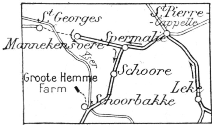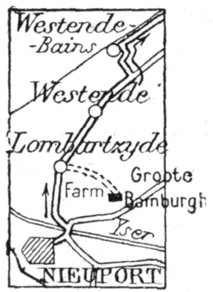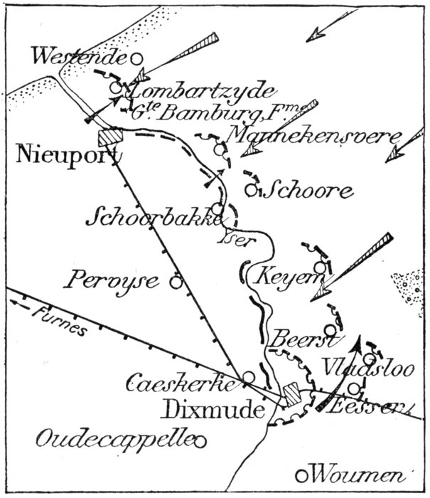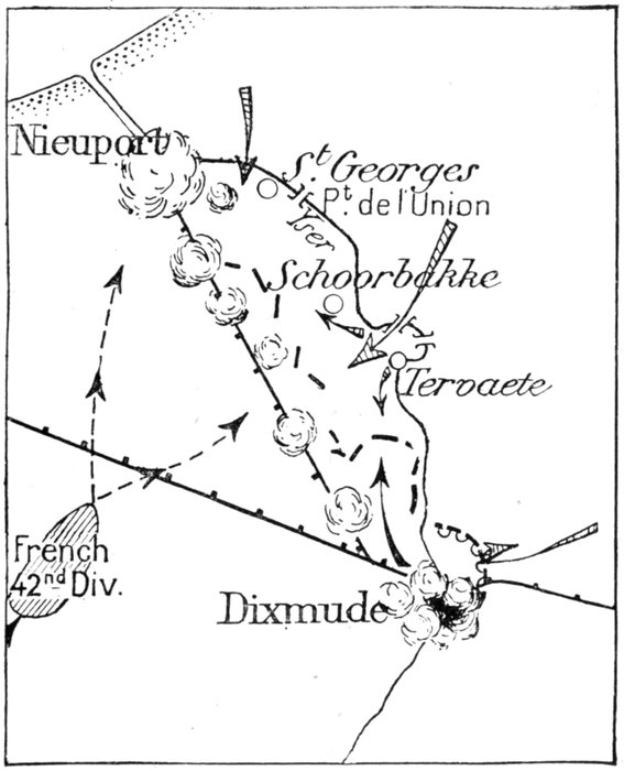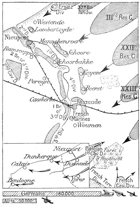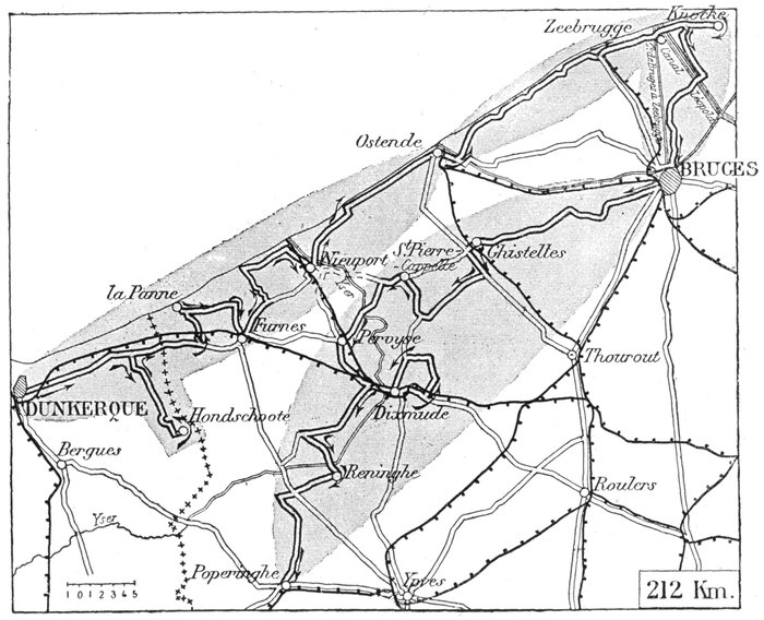 From the sea to Zuydschoote (8 km. North of Ypres), the Belgian Army was at first obliged, with the help of only 6,000 French Marines, to hold a twenty-two mile front.