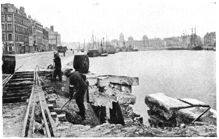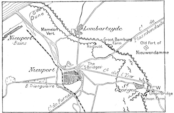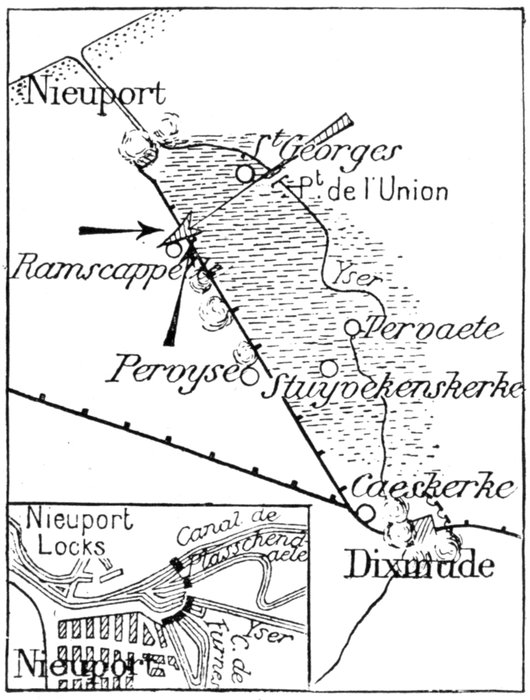 The Yser, a small coastal river, having its source in French Flanders empties itself into the sea between two jetties. Its shallow bed, dredged along the greater part of its course, describes a wide semi-circle. At its mouth, at Nieuport, the Yser and the canals which likewise end there, are closed by a series of locks, which shut out the sea at high tide and prevent it from invading the plain through the streams and canals.