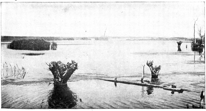 Formerly, flocks of sheep and herds of cattle, tended by grey-coated shepherds, grazed in this plain. Immense fields of beet and turnips alternated with the meadows. Hedges, willows, clusters of bending poplars, and the roofs of the low farmsteads built on little hillocks, broke the monotony of the landscape. Here, where peace and prosperity reigned, the inundations and war have left a vast expanse of reeds, in which the roads, ruined farmhouses and a few broken trees stand out dismally.