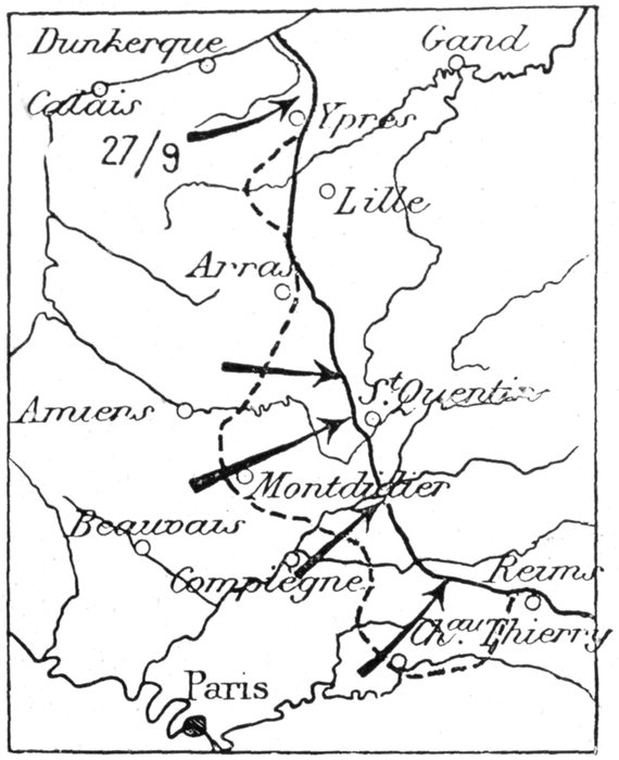 General Joffre parried the manœuvre, and while strengthening the 6th Army, formed a mobile corps on his left wing, strong enough to withstand the enemy's outflanking movement.