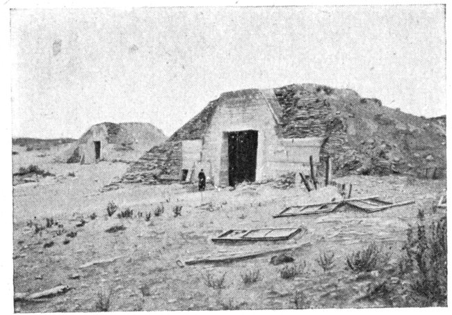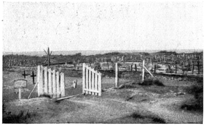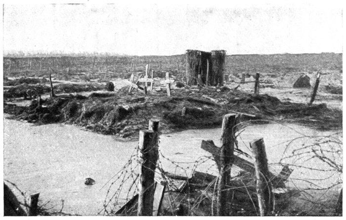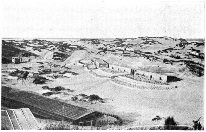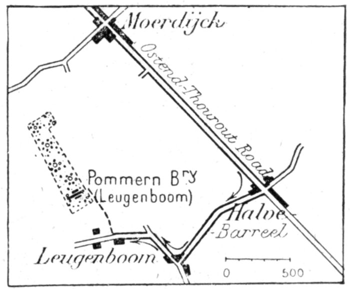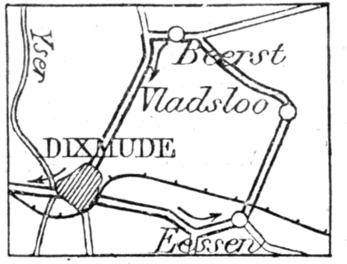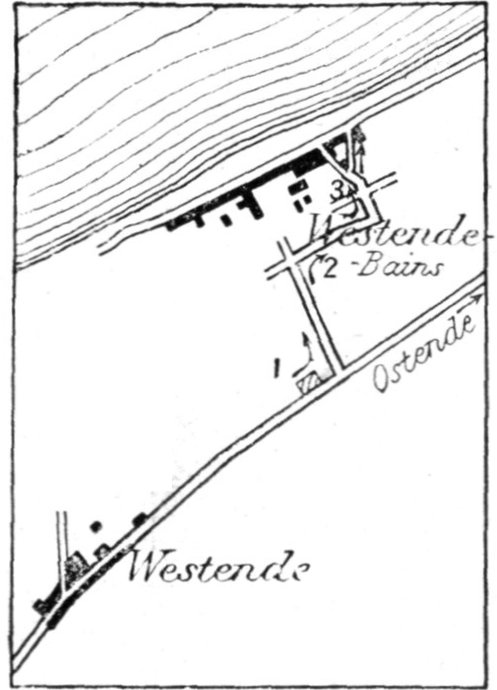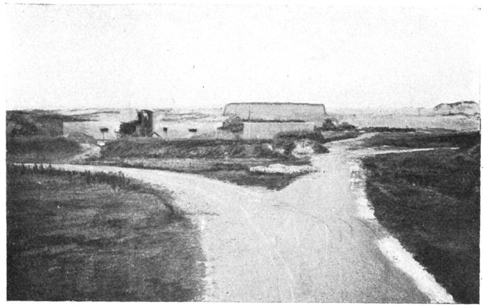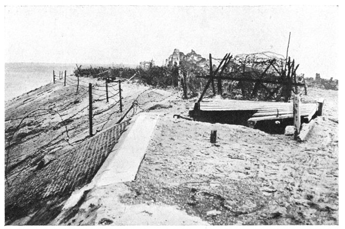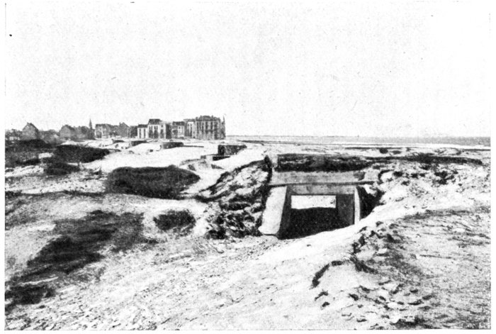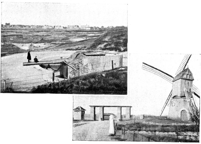 The plain is bounded on the west by a line of wind-formed sand dunes planted with oyats. These dunes extend along the straight unbroken coast. To the east of Dixmude rises a series of heights, which, marking the beginning of the solid ground, are continued further east by the long unbroken crest of Clerken.