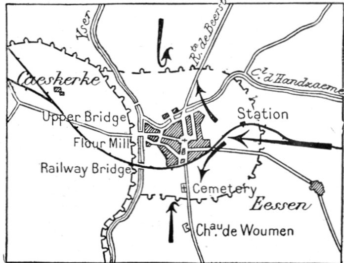 On the 18th, the enemy hurriedly attempted to crush the defenders, before reinforcements arrived. After a violent bombardment, a powerful attack was launched against the Mannekensvere-Schoore-Keyem-Beerst line, held by units of the Belgian 2nd, 1st and 4th Divisions.
