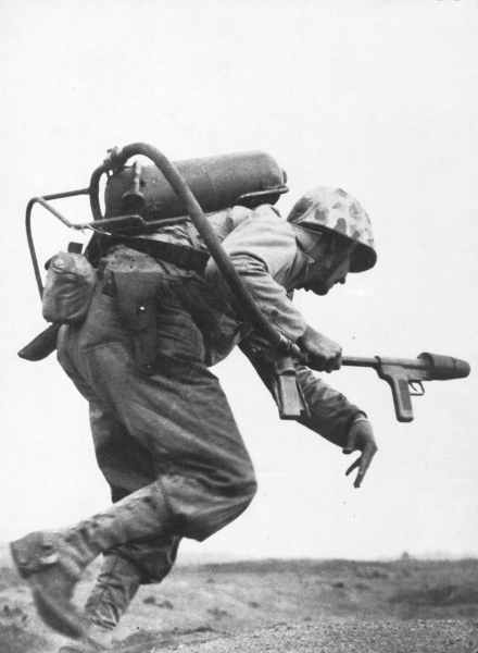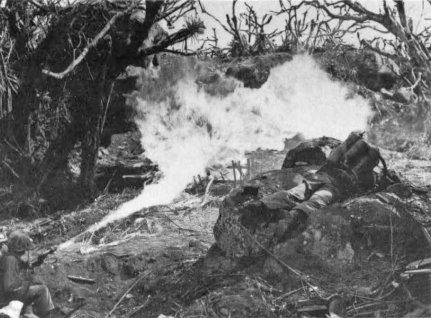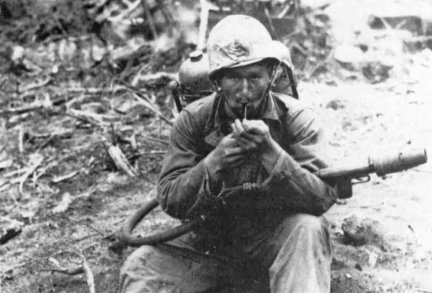 At the end of a very long fight, a Marine flamethrower operator pauses to light up.