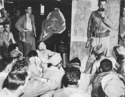 Members of the 4th Marine Division receive a last-minute briefing before D-day.