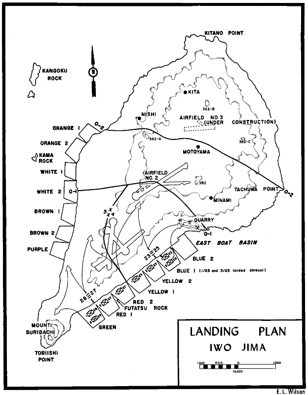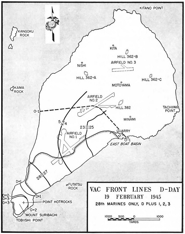 General Schmidt issued VAC Operation Plan 5-44 on 23 December 1944. The plan offered nothing fancy. Mount Suribachi dominated both potential beaches, but the 3,000 yards of black sand along the southeastern coast appeared more sheltered from the prevailing winds. Here the V Amphibious Corps would land on D-day, the 4th Marine Division on the right, the 5th on the left, the 3d in reserve. The initial objectives included the lower airfield, the west coast, and Suribachi. Then the force would swing into line and attack north, shoulder to shoulder.