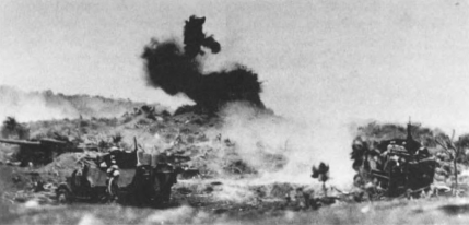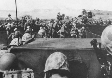 The planes had barely disappeared when naval gunfire resumed, carpeting the beach areas with a building crescendo of high-explosive shells. The ship-to-shore movement was well underway, an easy 30-minute run for the tracked landing vehicles (LVTs). This time there were enough LVTs to do the job: 68 LVT(A)4 armored amtracs mounting snub-nosed 75mm cannon leading the way, followed by 380 troop-laden LVT 4s and LVT 2s. The waves crossed the line of departure on time and chugged confidently towards the smoking beaches, all the while under the climactic bombardment from the ships. Here there was no coral reef, no killer neap tides to be concerned with. The Navy and Marine frogmen had reported the approaches free of mines or tetrahedrons. There was no premature cessation of fire. The “rolling barrage” plan took effect. Hardly a vehicle was lost to the desultory enemy fire.