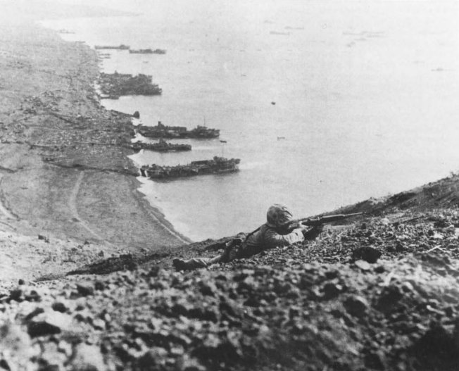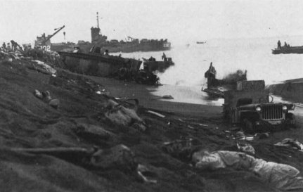 As soon as it hit the beach on the right side of the V Amphibious Corps line, the 25th Marines was pinned down by accurate and heavy enemy fire. Meanwhile, landing craft, supplies, and vehicles pile up in the surf behind Marines.