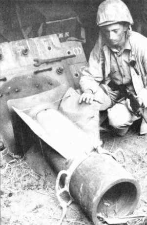 A Marine inspects a Japanese coastal defense gun which, although protected by steel-reinforced concrete, was destroyed in prelanding naval gunfire bombardments.