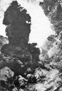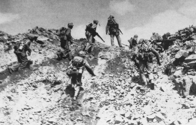 The 3d Battalion, 28th Marines, finds the terrain on Iwo Jima more broken and forbidding than the black sands of the beaches as they advance in a frontal attack northward against unremitting fire from determined Japanese troops.
