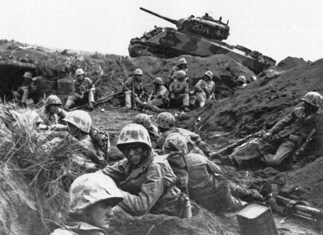 Weary troops of Company G, 2d Battalion, 24th Marines, rest in a ditch, guarded by a Sherman tank. They are waiting for the tanks to move forward to blast the numerous pillboxes between Motoyama Airfields No. 1 and No. 2.