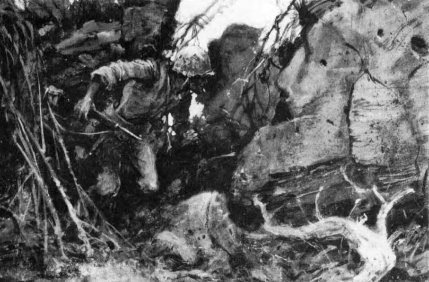 No assault units found it easy going to move inland, but the 25th Marines almost immediately ran into a buzz-saw trying to move across Blue14 Beach. General Cates had been right in his appraisal. “That right flank was a bitch if there ever was one,” he would later say. Lieutenant Colonel Hollis W. Mustain’s 1st Battalion, 25th Marines, managed to scratch forward 300 yards under heavy fire in the first half hour, but Lieutenant Colonel Chambers’ 3d Battalion, 25th Marines, took the heaviest beating of the day on the extreme right trying to scale the cliffs leading to the Rock Quarry. Chambers landed 15 minutes after H-hour. “Crossing that second terrace,” he recalled, “the fire from automatic weapons was coming from all over. You could’ve held up a cigarette and lit it on the stuff going by. I knew immediately we were in for one hell of a time.”