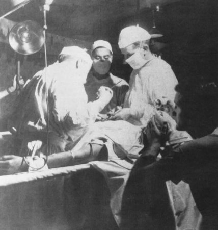 Installed in an abandoned Japanese dugout several thousand yards behind the fighting, 4th Marine Division surgeons operated on those badly wounded Marines and Navy corpsmen who might not have survived a trip to the hospital ship.