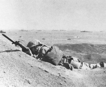 Uncommon valor in a peaceful setting: this 4th Division Marine threatens the enemy even in death. His bayonet fixed and pointing in the direction of the enemy, he was killed by a sniper before he even got off the beach on D-day.