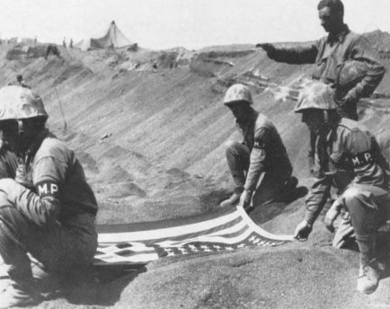 With his buddies holding the four corners of the National Colors, the last rites for a fallen Marine are offered by the chaplain at a temporary gravesite in Iwo’s black sand. Chaplains of all religious persuasions heroically ministered to all Marines and Corpsmen throughout the thick of the fighting at their own risk.
