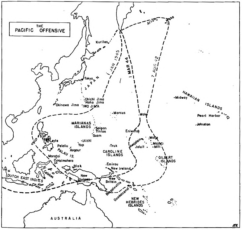 American servicemen had awaited the coming of the B-29s for years. The “very-long-range” bombers, which had become operational too late for the European War, had been striking mainland Japan since November 1944. Results proved disappointing. The problem stemmed not from the pilots or planes but rather from a vexing little spit of volcanic rock lying halfway along the direct path from Saipan to Tokyo—Iwo Jima. Iwo’s radar gave the Japanese defense authorities two hours advance notice of every B-29 strike. Japanese fighters based on Iwo swarmed up to harass the unescorted Superforts going in and especially3 coming home, picking off those bombers crippled by antiaircraft (AA) fire. As a result, the B-29s had to fly higher, along circuitous routes, with a reduced payload. At the same time, enemy bombers based on Iwo often raided B-29 bases in the Marianas, causing some damage.