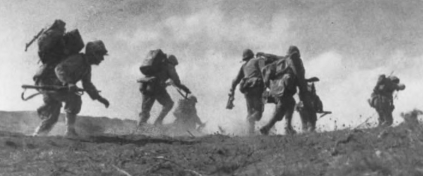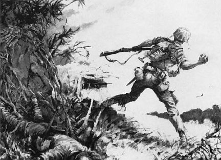 Burdened with heavy packs and equipment, Marine communicators dash for cover while advancing under heavy fire during the drive inland from the beaches.
