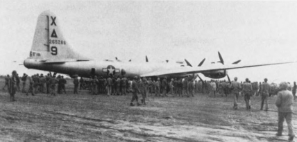 “Dinah Might,” the first crippled B-29 to make an emergency landing on Iwo Jima during the fighting, is surrounded by Marines and Seabees on 4 March 1945.