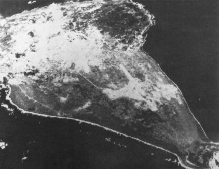 An aerial view of Iwo Jima before the landing clearly shows “pork chop” shape. Mount Suribachi, in the right foreground, is at the southern end of the island.