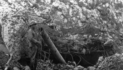 A Marine inspects a Japanese coastal defense gun which, although protected by steel-reinforced concrete, was destroyed in prelanding naval gunfire bombardments.